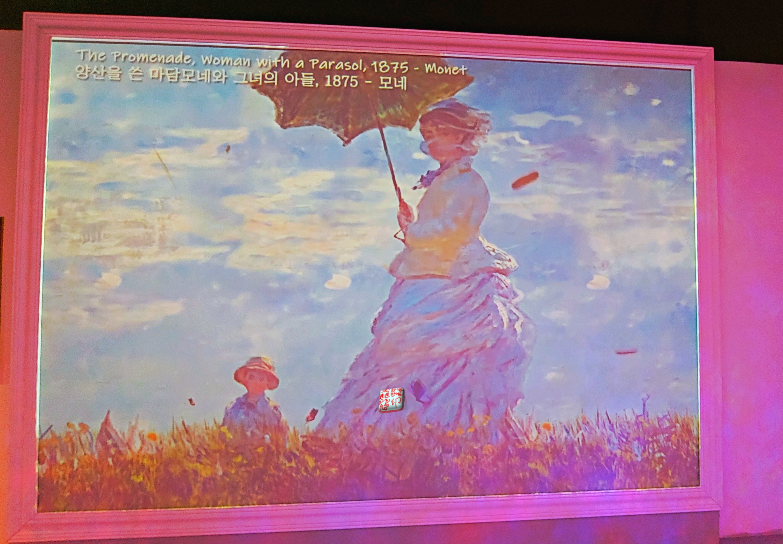 모네 부인과 파라솔을 든 그녀의 아들이라는 제목의 그림입니다.
