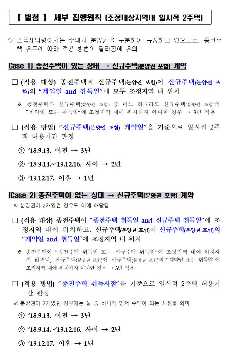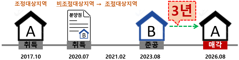 – 조정지역 밖에 신규주거권 및 기존주택이 있는 경우 – 미조정지역의 1가구 및 2가구 주택은 기존주택을 3년 이내에 매각할 경우 임시면제 구입일로부터 3년 이내에 기존 주택을 매각해야 하는 날짜와 구입 권리가 부여됩니다.