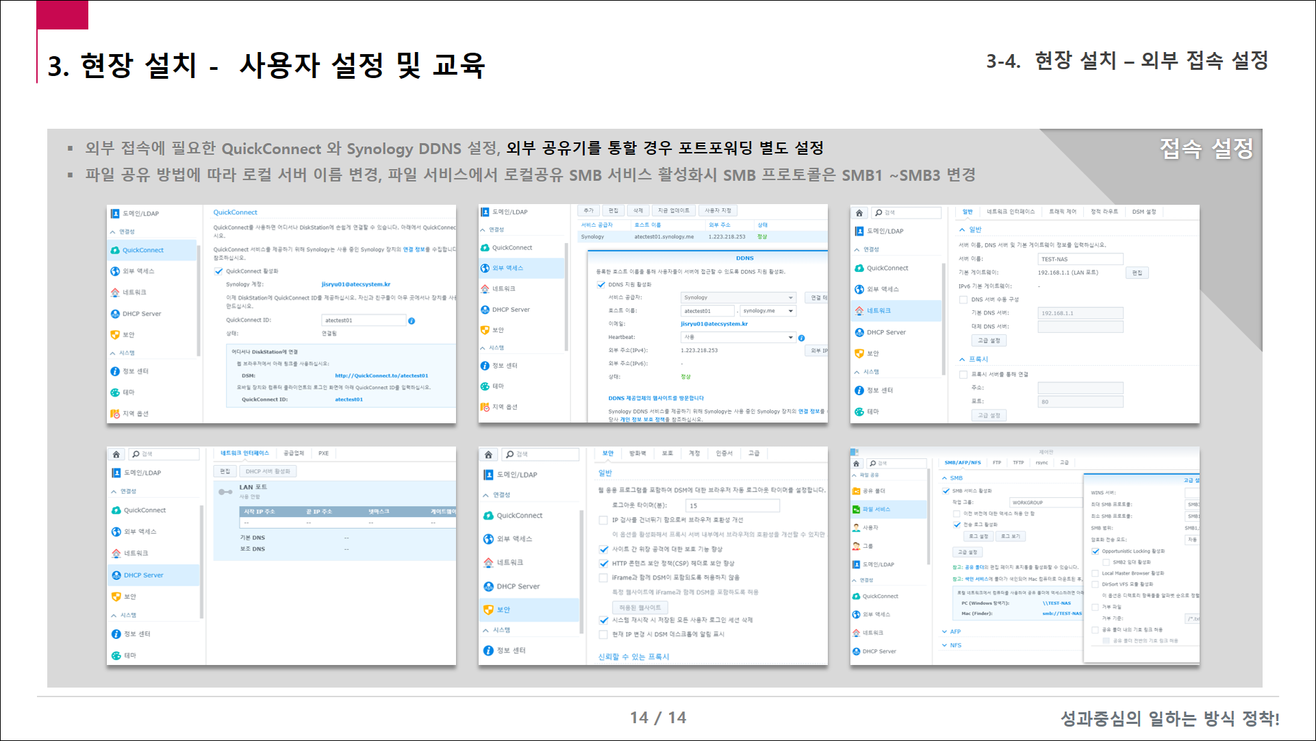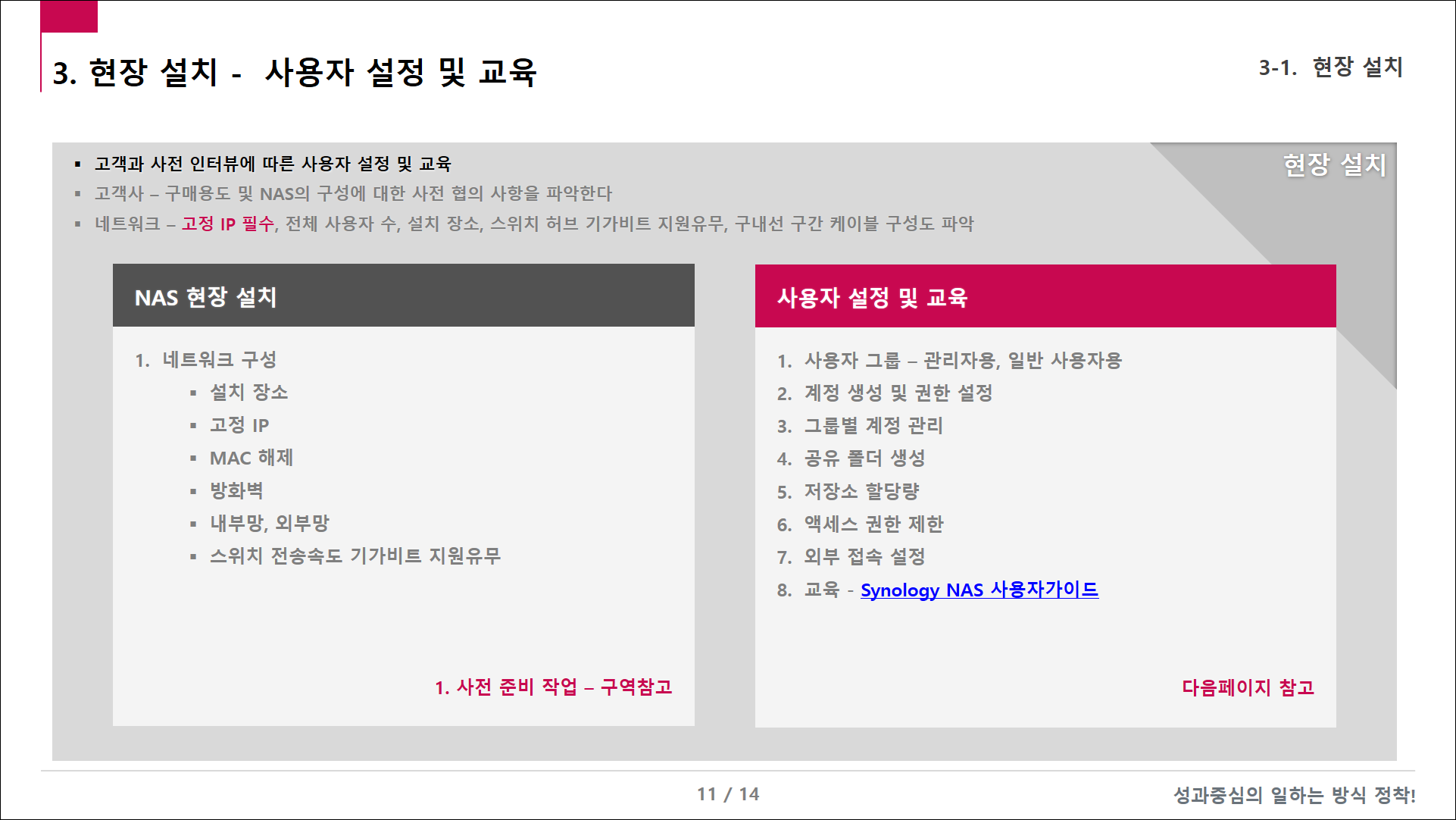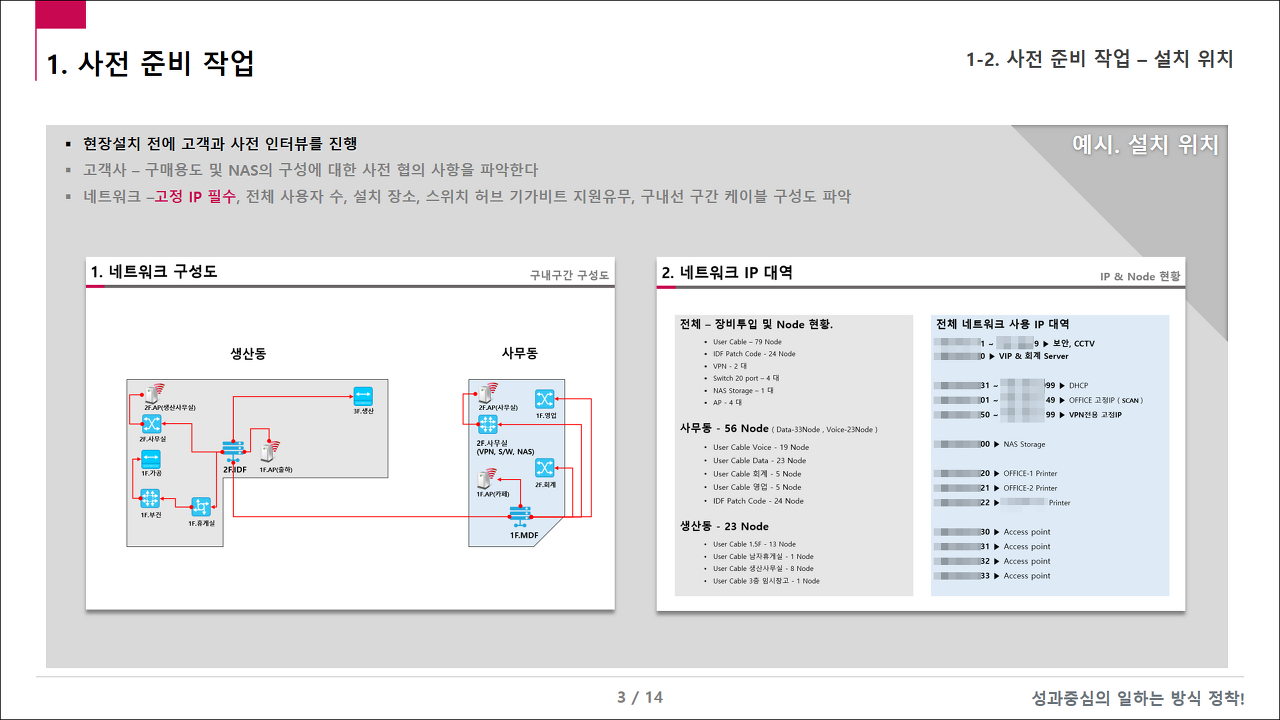 - 고객 네트워크와 협력하는 방법 – 고정 IP(필수), 설치 위치, 스위치 허브 기가비트 지원 여부, 구내 회선 구간 케이블 구성도 파악