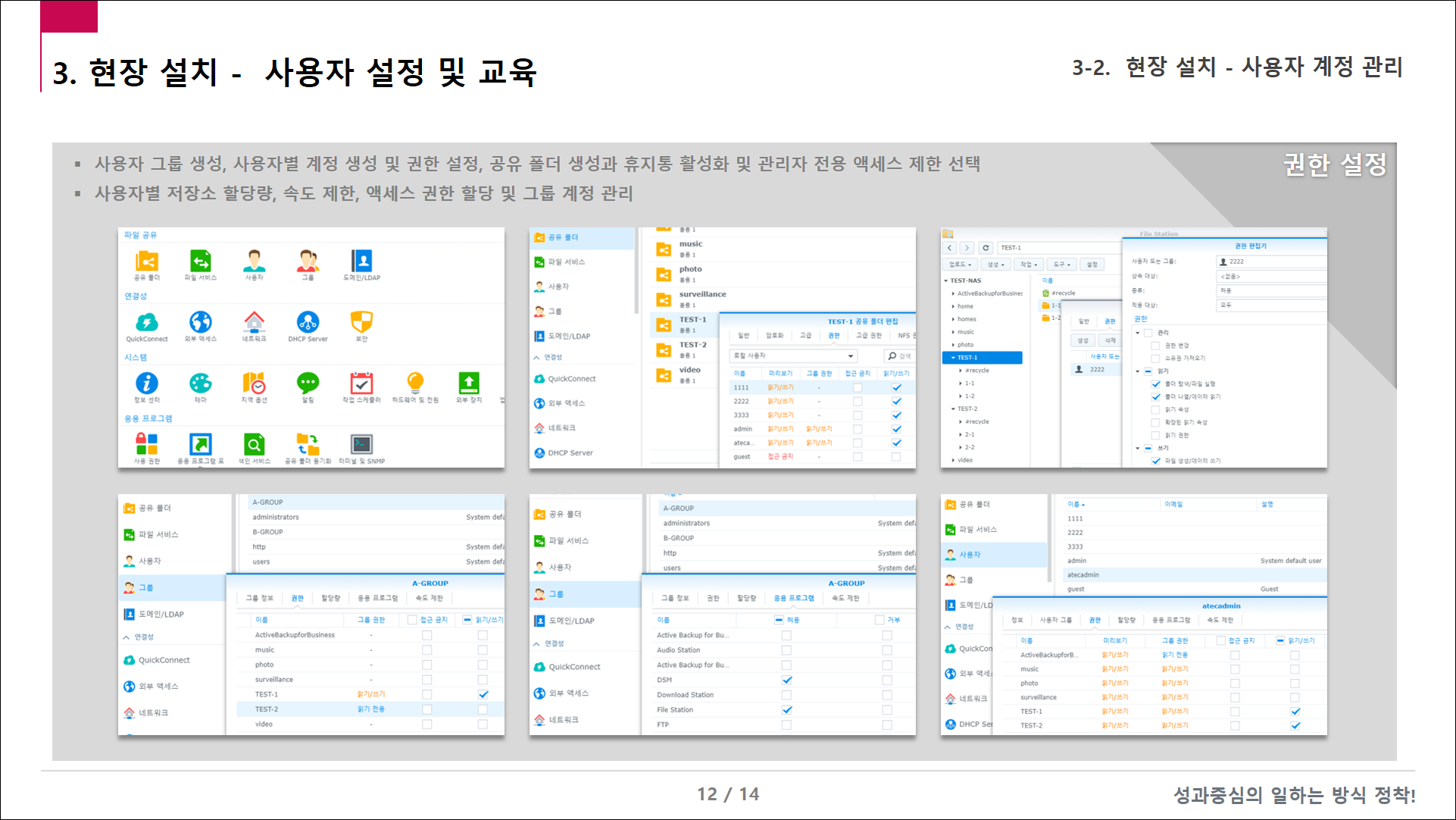 - 사용자 그룹 생성, 각 사용자에 대한 계정 생성 및 권한 설정, 휴지통 활성화, 관리자만 액세스 제한
